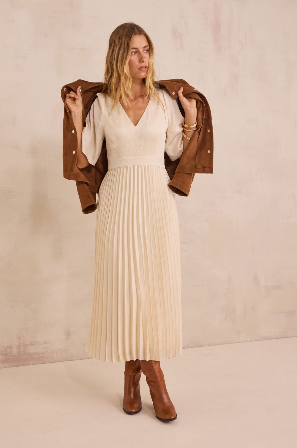 Discover BILLIE, our new long dress with an elegant and feminine style. With its flattering V-neck and delicate pleats, it adds a touch of sophistication to your wardrobe.
