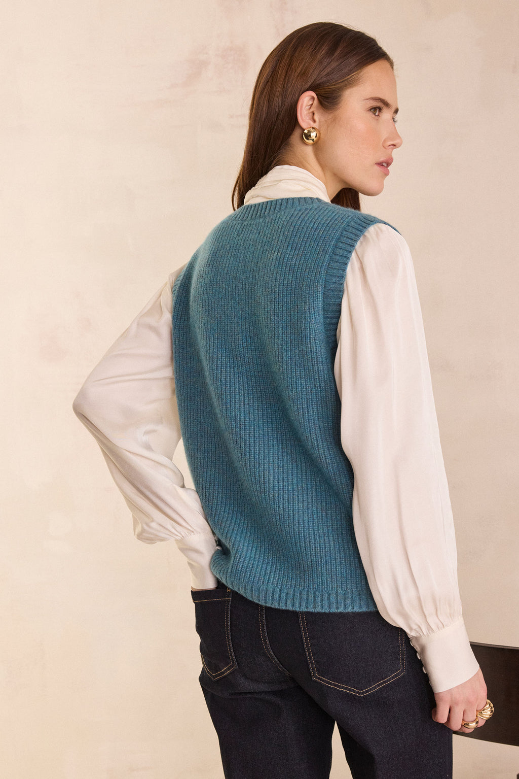 Discover PACO, our sleeveless cardigan in a wool and cashmere blend. Its soft texture and timeless style make it an ideal piece to complete your mid-season outfits.