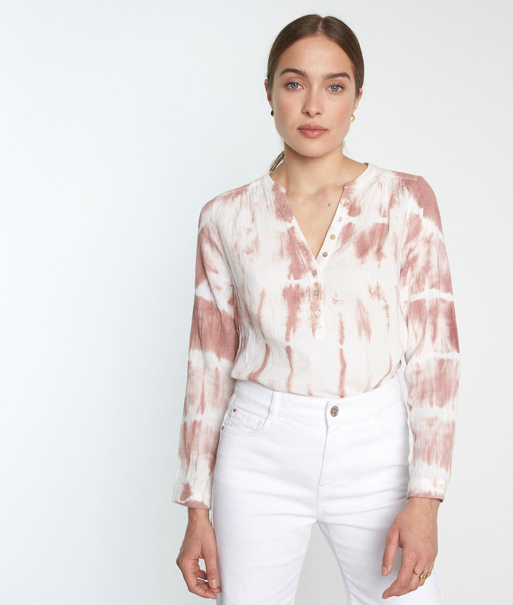 Our LAETI loose-fitting blouse is original and delicate. You'll love the tie-dye print and gentle colour that will cheer up your spring looks. With its Henley neck button placket and long sleeves. LAETI is the perfect blouse for the season. Wear it with white shorts and sandals for a fresh and feminine look.