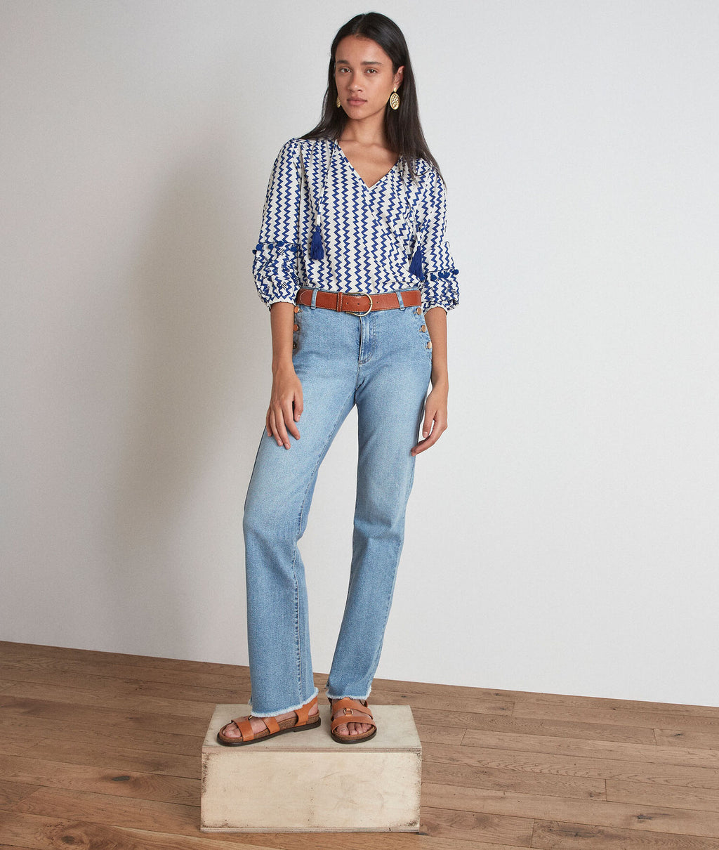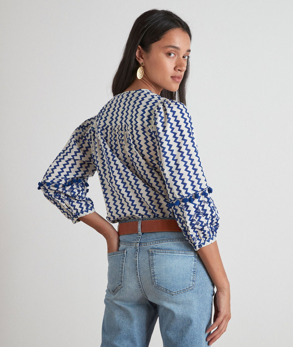Made from cotton, this blouse will charm you with its unusual details. We love the highly elegant mustard yellow graphic print, the cotton pompoms that trim the sleeves and the scattering of delicate fine embroidery.