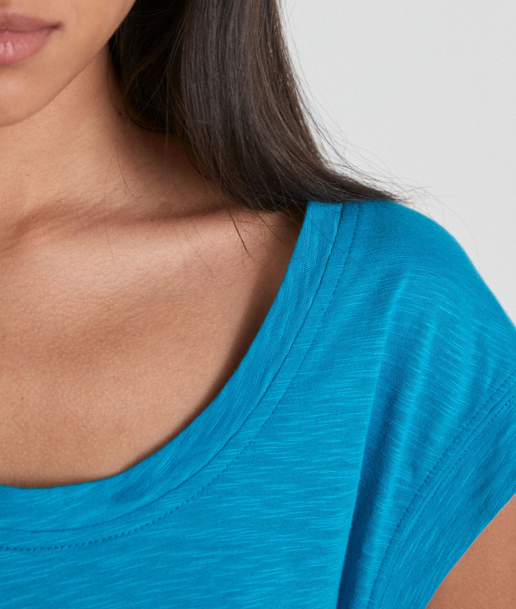 We love the turquoise colour perfect for summer, the wide round neck and the short sleeves.