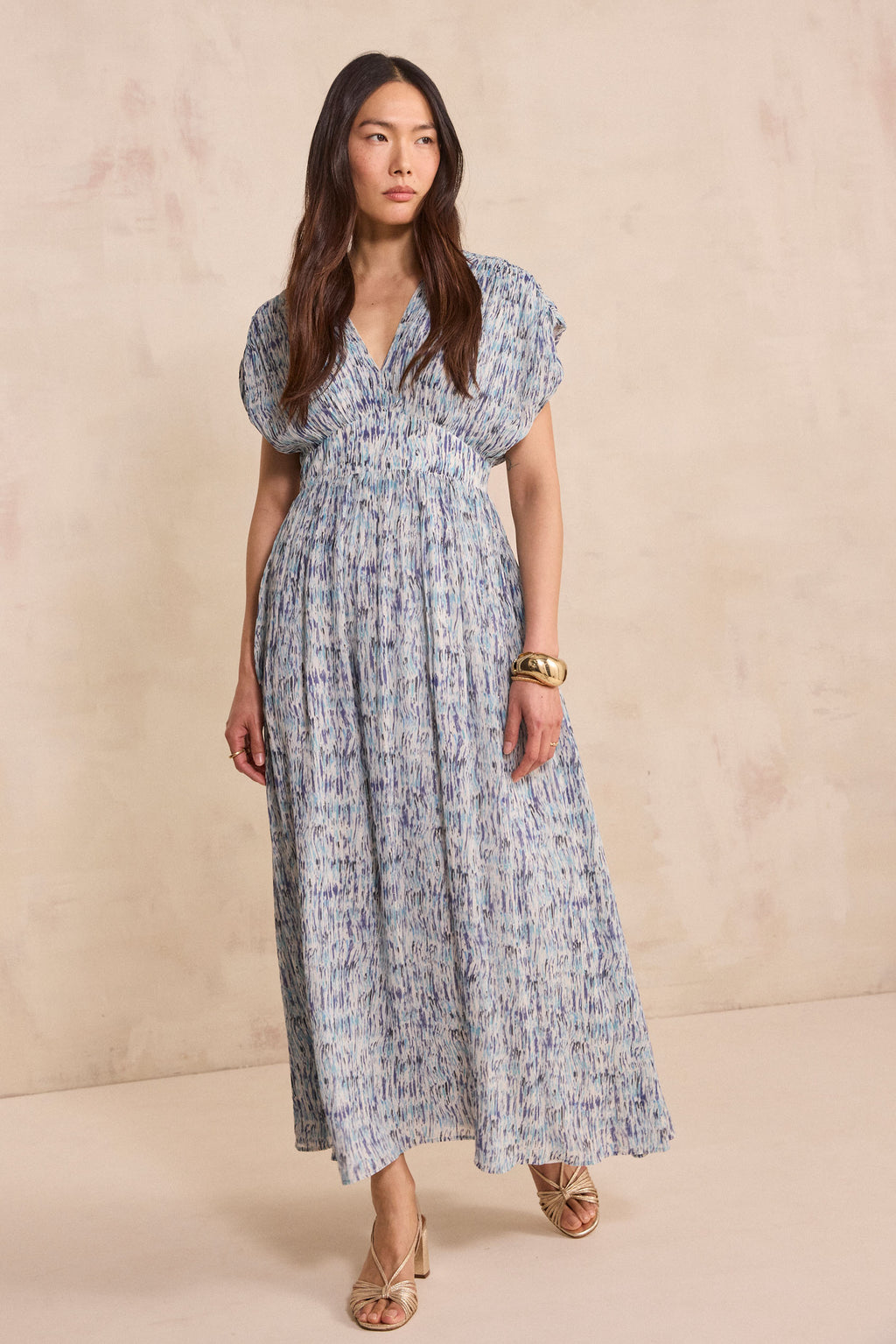 Discover the fluid BLUE dress with its soft flow and delicate print.