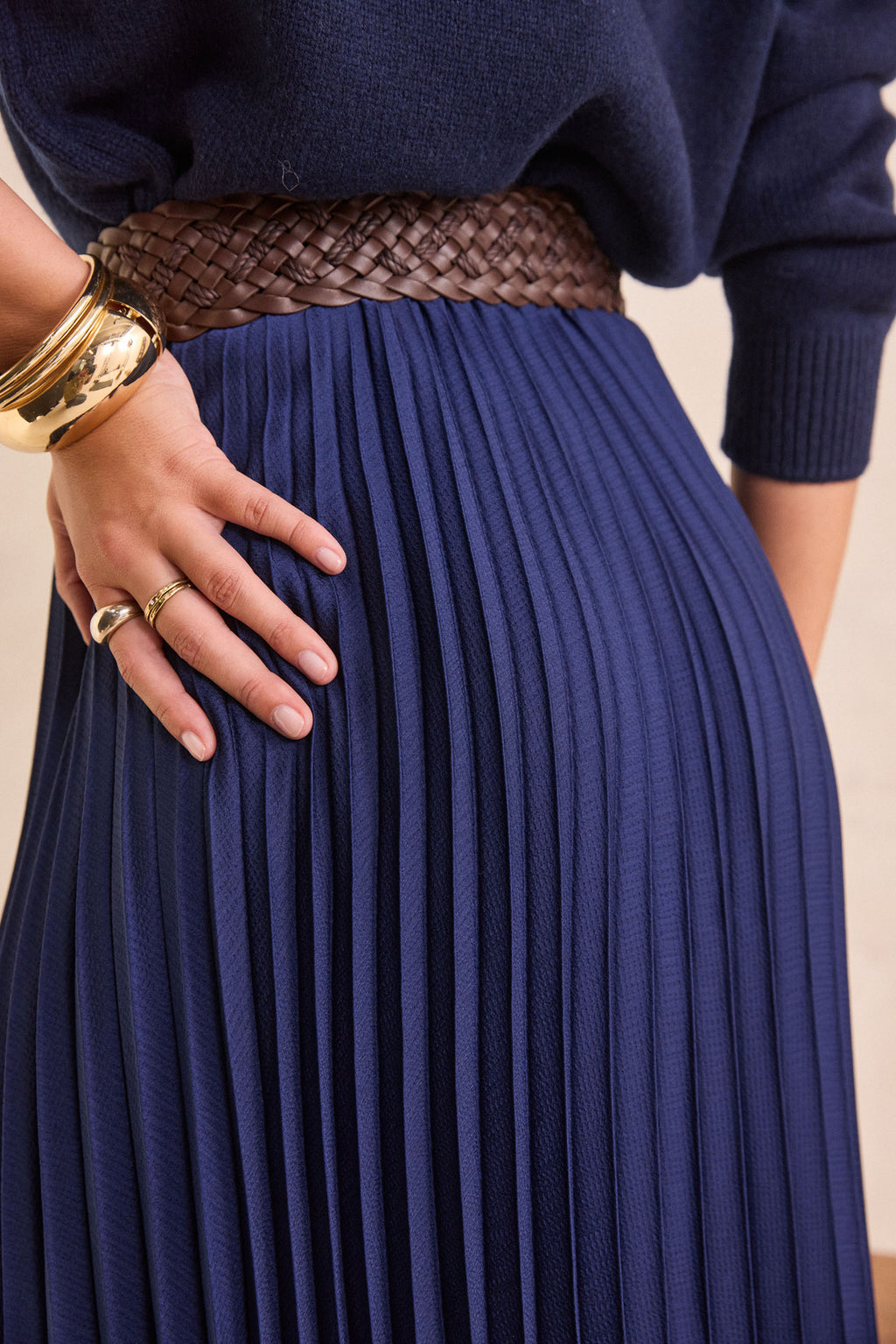 Discover ESTHER, our long pleated skirt with an elegant and feminine style. Its fluid cut and delicate pleating bring movement and lightness to your silhouette.