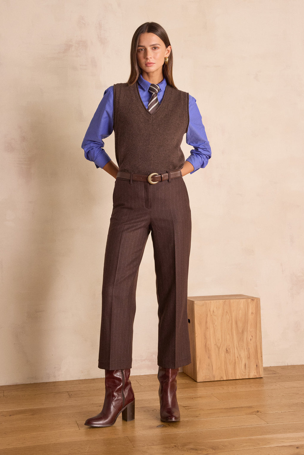 Fall for MELINA, our striped wool trousers that combine elegance and contemporary style. Its wide cut and cropped length make it a trendy and easy-to-wear piece.