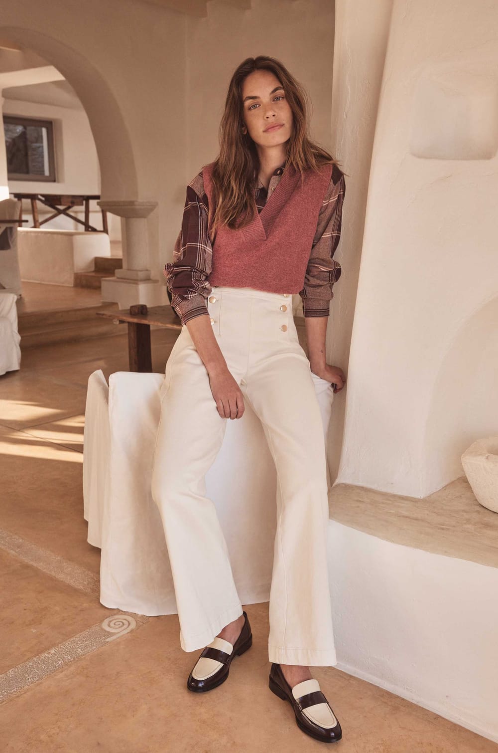 WECARE: These trousers are made from organic cotton. By choosing organic cotton we can stop using GMOs and start using natural fertilisers and pesticides. Organic cotton also consumes 90% less water than conventional cotton as the crop is primarily watered by rain. Our organic cotton is independently certified by bodies such as OCS and GOTS.You'll love OXAN our very elegant white sailor trousers.