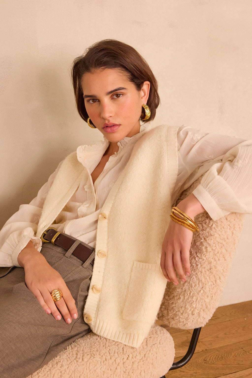 Fall for BORIS, our boucle wool cardigan. Its noble material and sleeveless cut make it an elegant piece that's easy to wear in any season.