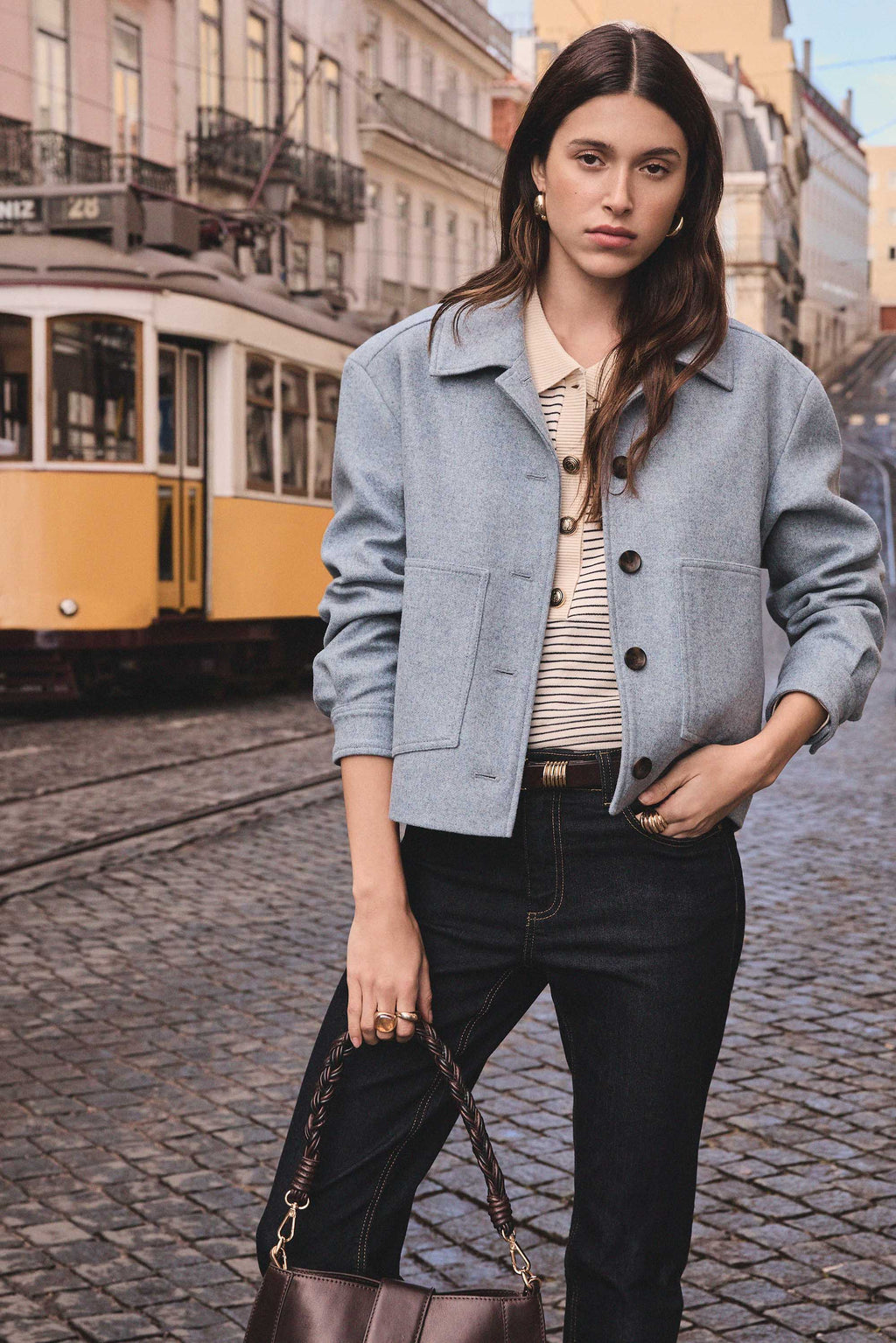 Discover COLOMBE, our short jacket in wool blend that adds a touch of elegance to all your outfits. With its single-breasted design and structured cut, it stands as an essential piece in your wardrobe.