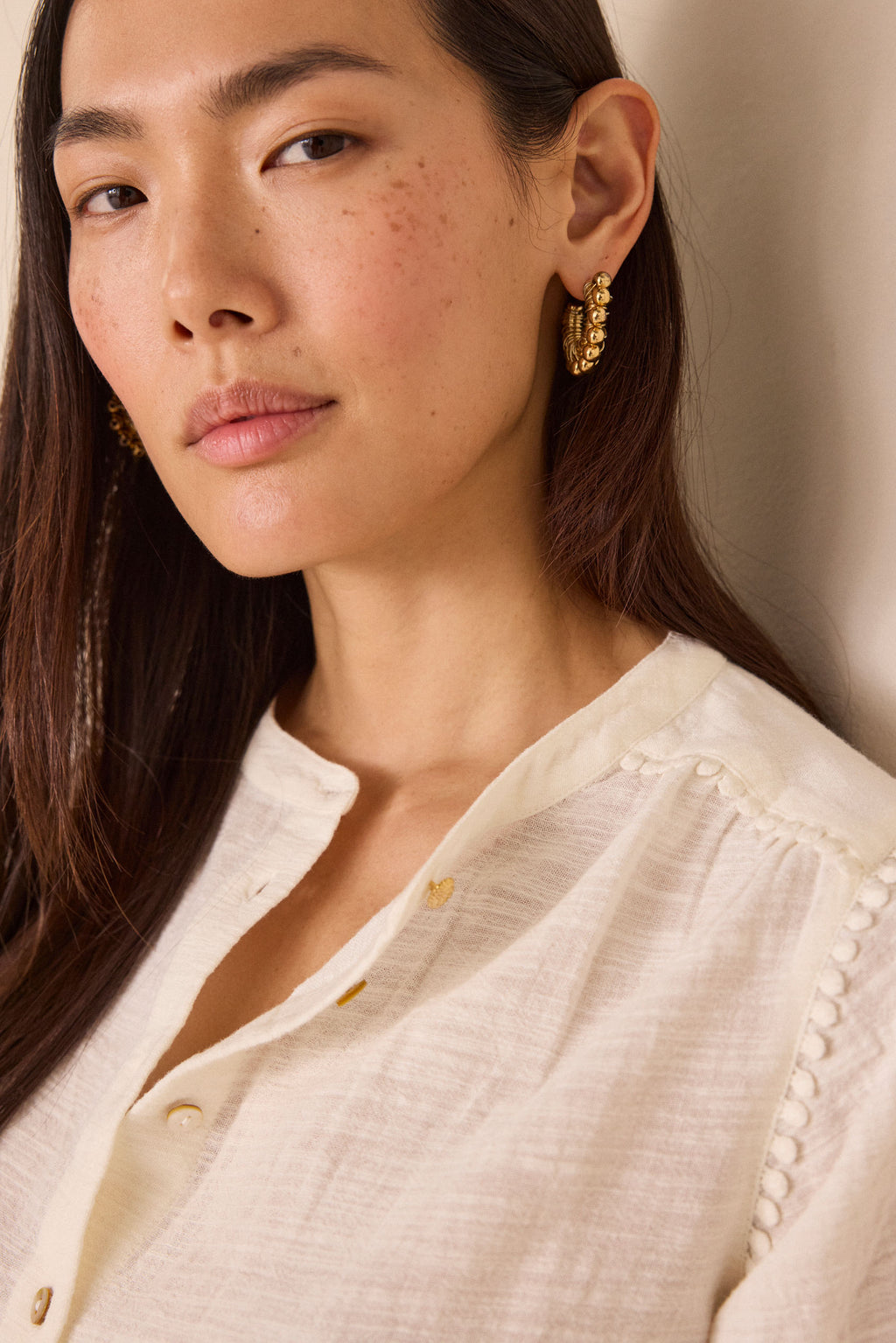 Discover DALIA, our new embroidered blouse with a feminine and delicate style. Its bubble embroidery brings a touch of originality to this timeless piece in natural cotton.